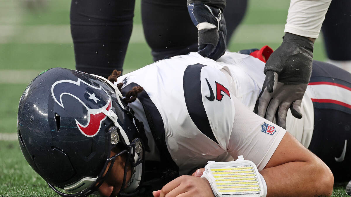 EAST RUTHERFORD, N.J. – Texans rookie quarterback C.J. Stroud’s head hit the ground in the fourth quarter as he was shaken up in the fourth quarter against the New York Jets on a rush from defensive tackle Quinnen Williams, absorbing a late shot.